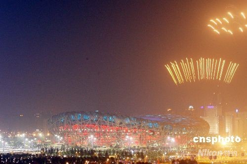 8月8日晚,第29屆奧林匹克運(yùn)動會在北京開幕。象征腳印的焰火“走”進(jìn)鳥巢。中新社發(fā) 毛建軍 攝