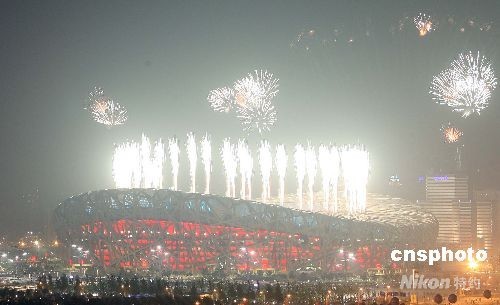 八月八日晚,第二十九屆奧林匹克運動會在北京開幕,煙花映紅北京夜空。中新社發(fā) 毛建軍 攝