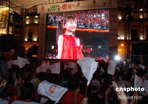 八月八日晚,澳門(mén)市民在議事亭前地通過(guò)大屏幕觀看北京奧運(yùn)會(huì)開(kāi)幕式,不時(shí)發(fā)出陣陣歡呼。 中新社發(fā) 畢永光 攝
