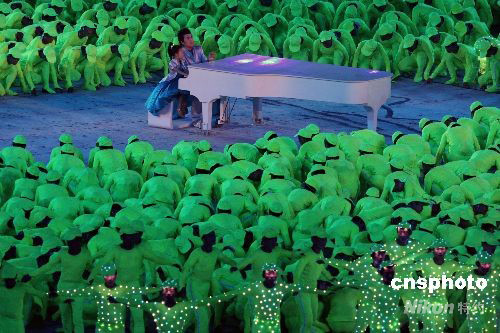 第二十九屆夏季奧運(yùn)會8月8日晚在北京奧林匹克公園內(nèi)的國家體育場舉行開幕式,由中國著名青年鋼琴家郎朗與女童譚小裳演奏“星光 ”曲。 中新社發(fā) 任晨鳴 攝