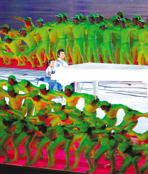 演出下篇開(kāi)始,只見(jiàn)郎朗坐在一片藍(lán)色的海洋中,身邊坐著一個(gè)天真稚氣的小女孩兒,圍繞在他周?chē)氖菬o(wú)數(shù)穿著高科技發(fā)光服的“綠”人,郎朗面帶微笑,一臉輕松和愉悅,音符從十指間滑出,周?chē)膱?chǎng)景隨之不斷發(fā)生著奇妙變化,藍(lán)色的海洋開(kāi)始呈現(xiàn)出中國(guó)現(xiàn)代化建設(shè)成就,青藏鐵路也出現(xiàn)在郎朗的腳下。而“綠”人身上的光也隨之變化為銀色,變換出和平鴿、銀河等造型,最后濃縮為一座微型的鳥(niǎo)巢,郎朗在“巢中巢”歡快地彈奏,一個(gè)小女孩飛進(jìn)巢中巢,乘著風(fēng)箏飛到他面前,充滿詩(shī)意。整個(gè)節(jié)目長(zhǎng)達(dá)8分鐘,成為本屆開(kāi)幕式上分量最重的個(gè)人演出。在演出結(jié)束的第一時(shí)間,通過(guò)萬(wàn)寶龍公司的幫助,本報(bào)對(duì)郎朗進(jìn)行了專(zhuān)訪。