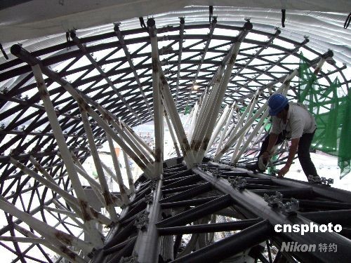 圖為氣房子建造好以后,火炬第一次開進氣房子,工人進入火炬內部檢查。中新社發(fā) 佟偉 攝