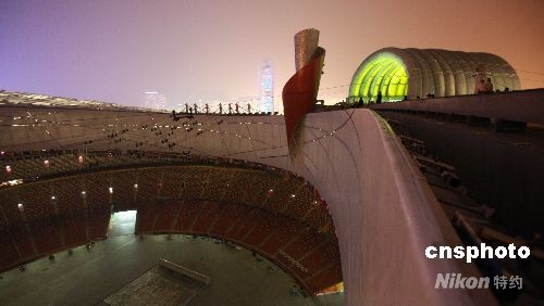 圖為31米高、50余噸重的火炬塔豎立在鳥巢頂上。中新社發(fā) 佟偉 攝