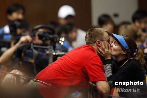 圖:埃蒙斯奪北京奧運首金后親吻丈夫