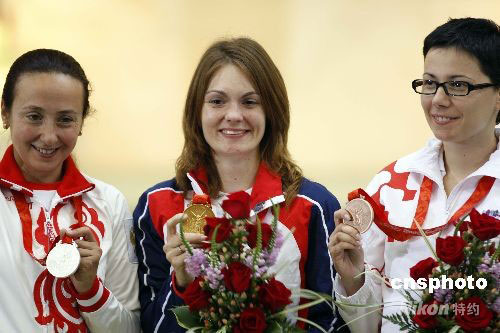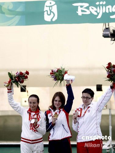 8月9日,北京奧運(yùn)會(huì)開賽的第一天,女子10米氣步槍決賽在北京射擊館進(jìn)行,捷克選手埃蒙斯(中)以503.5環(huán)的成績獲得冠軍,并創(chuàng)造了新的奧運(yùn)會(huì)決賽紀(jì)錄,這也是本屆奧運(yùn)會(huì)的第一枚金牌。俄羅斯選手加爾金娜(左)以502.1環(huán)的成績獲得銀牌,克羅地亞選手斯涅扎娜-佩契奇(右)名列第三,成績?yōu)?00.9環(huán),中國選手杜麗排名第五無緣獎(jiǎng)牌。中新社發(fā) 盛佳鵬 攝