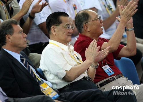 8月9日上午,中華臺北選手陳葦綾在北京奧運會女子舉重48公斤級決賽中獲得銅牌,中國國民黨榮譽主席連戰(zhàn)到場助威。中新社發(fā) 任晨鳴 攝