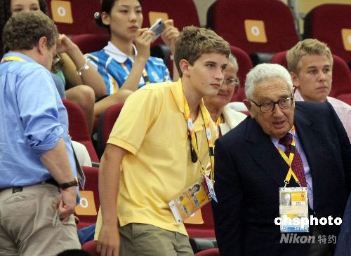 8月9日下午,中國女籃在北京奧運(yùn)會籃球館--五棵松體育館舉行的小組賽首場比賽中,以67比64險勝擊敗西班牙隊。前來參加北京奧運(yùn)會開幕式的美國前國務(wù)卿基辛格,在家人陪伴下到場觀看。中新社發(fā) 任晨鳴 攝