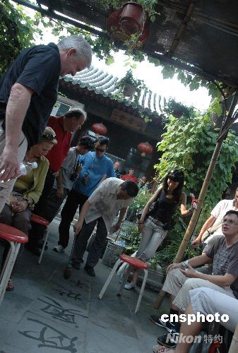 圖為奧地利游客8月9日下午游覽北京金絲胡同的四合院時(shí),觀賞主人在地上用水寫的歡迎書法。 中新社發(fā) 王辛莉 攝