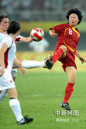 8月9日晚,中國女足在天津奧體中心水滴體育場與加拿大女足進行奧運第二場小組賽的較量,上半時雙方各進一球。中新社記者 陳文 攝