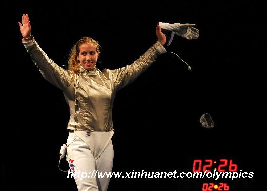 2008年8月9日 北京奧運會的擊劍項目展開。在女子佩劍個人賽決賽中美國選手瑪麗埃爾·扎格尼斯獲得冠軍。中國選手譚雪、包盈盈都沒有進入該項目的決賽。圖為美國選手瑪麗埃爾·扎格尼斯在比賽后慶祝勝利。新華社記者楊磊攝