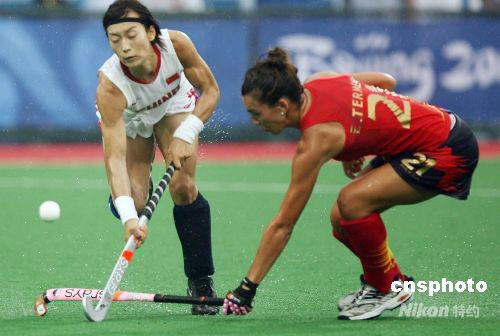 8月10日,中國(guó)女曲在北京奧運(yùn)會(huì)女子曲棍球小組賽首場(chǎng)比賽中以3:0戰(zhàn)勝西班牙隊(duì)。圖為雙方球員展開激烈爭(zhēng)奪。中新社發(fā) 武仲林 攝