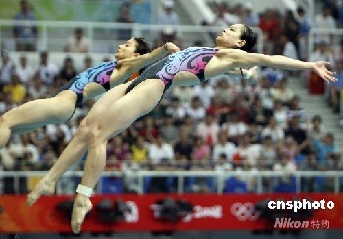 8月10日,素有“夢(mèng)之隊(duì)”之稱的中國(guó)跳水隊(duì)亮相水立方。黃金組合郭晶晶和吳敏霞獲得女子雙人三米板金牌。中新社發(fā) 杜洋 攝