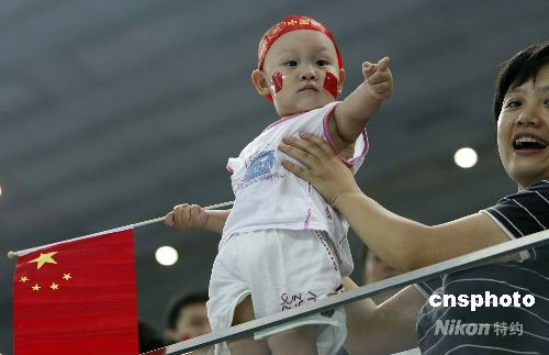 8月10日,跳水大戰(zhàn)在北京國家游泳中心“水立方”拉開帷幕。圖為一名“微型”拉拉隊(duì)隊(duì)員。中新社發(fā) 杜洋 攝
