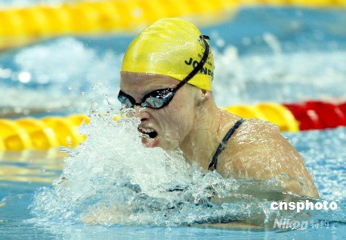 8月10日,澳大利亞著名選手瓊斯在女子100米蛙泳預(yù)賽中以1分05秒64的成績,打破了由羅雪娟創(chuàng)造的1分06秒64的奧運(yùn)會(huì)紀(jì)錄。 中新社發(fā) 杜洋 攝