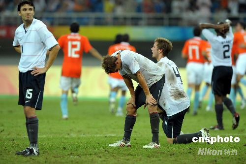 8月10日晚奧運男足天津賽區(qū),美國迎戰(zhàn)荷蘭隊,雙方最后以2:2戰(zhàn)平。圖為美國隊員遺憾沒守住最后3分鐘被荷蘭隊逼平。中新社發(fā) 陳文 攝