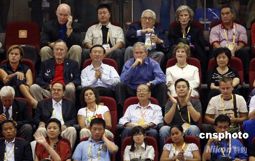 8月10日晚,北京奧運會男子籃球中國隊與美國“夢八隊”之戰(zhàn)在五棵松籃球館舉行,美國總統(tǒng)布什夫婦、老布什夫婦在中國外長楊潔篪陪同下與爆滿的觀眾共同觀看比賽。 中新社發(fā) 盛佳鵬 攝