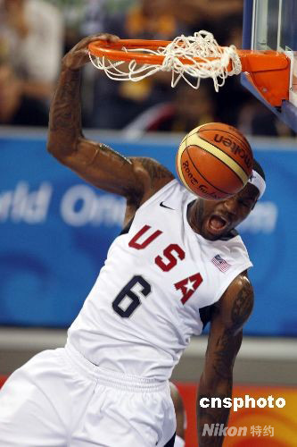 8月10日,奧運(yùn)男子籃球比賽中國男籃與美國男籃的比賽在北京五棵松籃球館正式開打。圖為美國6號(hào)隊(duì)員“小皇帝”詹姆斯飛身扣籃。中新社發(fā) 盛佳鵬 攝