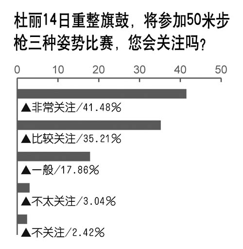 昨天的民調(diào)顯示,公眾和成龍一樣,仍然喜歡杜麗。14日,杜麗將重整旗鼓,出戰(zhàn)女子50米步槍三種姿勢(shì)射擊賽。調(diào)查發(fā)現(xiàn),分別有41.5%和35.2%的公眾表示對(duì)此非常關(guān)注和比較關(guān)注,不關(guān)注的公眾僅占5.4%。 (記者李濤)