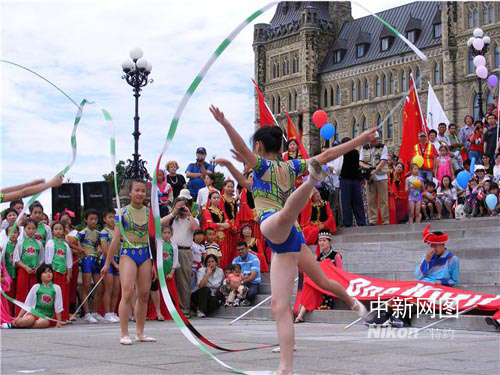 接下來(lái)的文藝演出精彩紛呈,加拿大朋友表演獨(dú)唱、合唱和民族舞蹈,尤其是武術(shù)表演更受到大家的歡迎。來(lái)自杭州青少年文化中心藝術(shù)體操隊(duì)的小演員們則表演了精彩的藝術(shù)體操。
