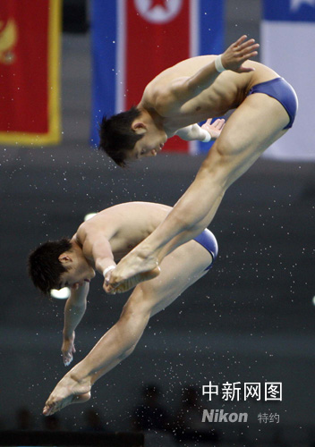 8月11日,中國組合林躍、火亮獲得北京奧運會男子10米雙人跳臺冠軍。中新社記者 杜洋 攝