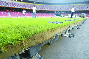 幾輛200噸的吊車將閉幕式設(shè)備吊進(jìn)地倉。新華社發(fā)