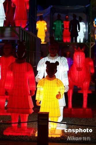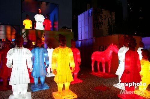 北京CBD內(nèi)充滿時(shí)尚感的世貿(mào)天階奧運(yùn)文化廣場(chǎng)上,102尊兵馬俑彩燈擺出氣勢(shì)恢弘的陣形。不是遠(yuǎn)自秦朝的陶土塑就,它們周身光彩奪目;不是身披鎧甲充滿殺氣,它們攜老扶幼,盡顯家庭歡樂(lè)。一個(gè)個(gè)燈彩透著歷史的深邃,也投身于眼前的奧運(yùn)狂歡。從即日起至8月24日,他們將以特殊的方式為人們講述中華文化的源遠(yuǎn)流長(zhǎng)。中新社發(fā) 富田 攝