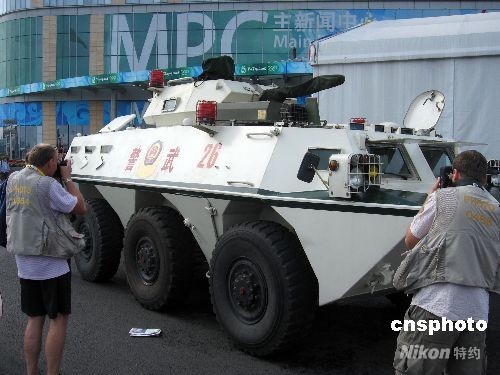 8月12日,一輛停在北京奧運(yùn)會(huì)主新聞中心的前的武裝巡邏車引起了許多媒體的注意。中新社發(fā) 杜洋 攝