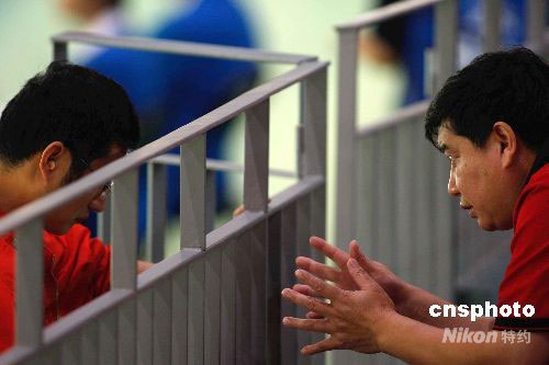 8月12日,北京奧運會男子50米手槍比賽在北京射擊館開戰(zhàn),譚宗亮和林忠仔代表中國射擊隊出戰(zhàn)。圖為在資格賽中,主教練王義夫臨場指導譚宗亮。中新社發(fā) 盛佳鵬 攝