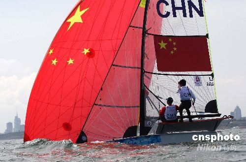 8月12日,北京奧運(yùn)會(huì)帆船比賽在青島繼續(xù)舉行,來自26個(gè)國家和地區(qū)的400多名運(yùn)動(dòng)員參加11個(gè)項(xiàng)目的角逐,天氣晴朗、風(fēng)力適中為比賽創(chuàng)造了極好的條件,中國選手李非和胡賢強(qiáng)在49人級(jí)比賽中發(fā)揮正常。中新社發(fā) 趙振清 攝