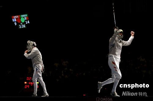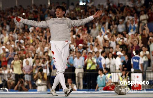 8月12日晚,08北京奧運會男子佩劍個人賽決賽在北京國際會議中心擊劍館揭開戰(zhàn)幕,賽會黑馬14號種子中國選手仲滿和法國選手洛佩茲在決賽中遭遇,結(jié)果中國選手仲滿以15-9戰(zhàn)勝對手獲得冠軍,這是中國男子擊劍在奧運會上第一次獲得冠軍。 中新社發(fā) 盛佳鵬 攝
