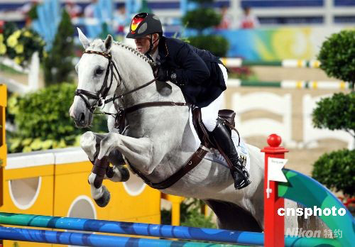 圖為獲得奧運(yùn)馬術(shù)三項賽團(tuán)體賽金牌的德國選手欣里!け颂亍ち_邁克 。