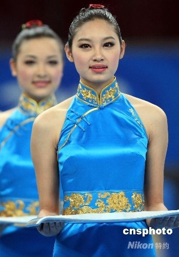 北京奧運會體操比賽在奧林匹克公園內的國家體育館舉行,許多觀眾與記者認為,這里的禮儀小姐最美。中新社發(fā) 任晨鳴 攝