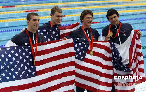 8月13日,美國(guó)游泳隊(duì)在“水立方”舉行的北京奧運(yùn)會(huì)男子4x200米自由泳接力比賽中,以6分58秒56的成績(jī)打破他們保持的7分03秒24的世界紀(jì)錄,并奪得金牌。中新社發(fā) 杜洋 攝