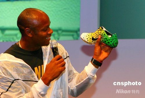 8月12日夜,世界短跑名將鮑威爾在北京發(fā)布強力短跑釘鞋,鮑威爾本人參與該跑鞋的設計過程。圖為他在展示該跑鞋。中新社發(fā) 沈晨 攝
