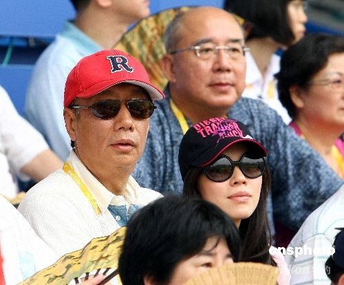 8月13日,2008北京奧運(yùn)棒球賽在五棵松體育中心舉行中華臺(tái)北隊(duì)對(duì)戰(zhàn)荷蘭隊(duì),郭臺(tái)銘(左)和妻子曾馨瑩也到場(chǎng)看球。中新社發(fā) CNAsports 攝