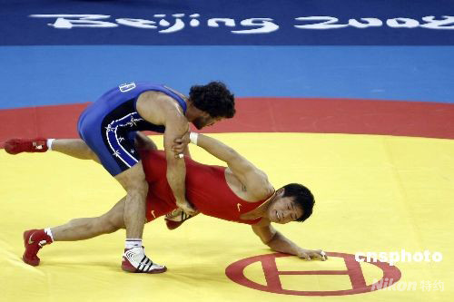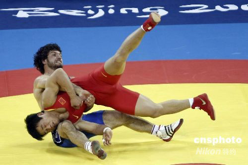 8月13日,北京奧運會摔跤男子古典式74公斤級冠亞軍決賽中,中國選手常永祥(紅)不敵格魯吉亞選手馬努恰爾·克維克利亞,獲得銀牌。這枚銀牌也創(chuàng)造了中國男子摔跤隊在奧運會比賽的最佳成績。 中新社發(fā) 盛佳鵬 攝