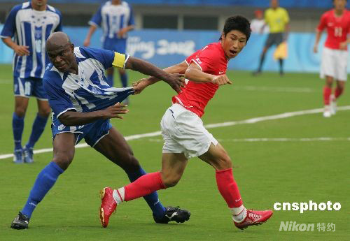 8月13日,北京奧運會男足小組賽,韓國VS洪都拉斯的比賽在上海體育場進(jìn)行。激烈的比賽使得場上球員在拼搶時的拉扯動作就像“摔跤”高手。 中新社發(fā) 湯彥俊 攝
