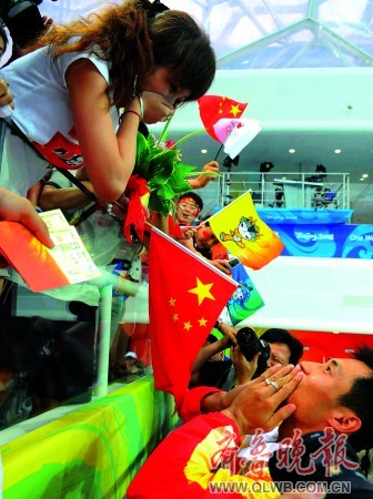 13 日下午,“水立方”上演了一幕浪漫的愛(ài)情故事,王峰在頒獎(jiǎng)儀式結(jié)束后,跨越“護(hù)欄”,將手中的鮮花獻(xiàn)給了看臺(tái)上為自己加油助威的妻子。