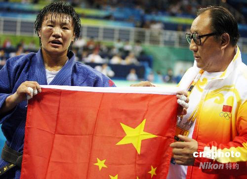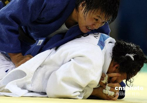 8月14日晚,中國女子柔道名將楊秀麗(藍(lán))在北京奧運(yùn)會女子柔道78公斤級決賽中擊敗古巴名將亞倫妮斯·卡斯蒂略獲得金牌。中新社發(fā) 任晨鳴 攝