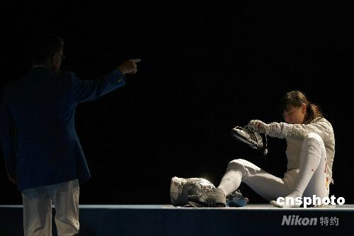 8月14日,北京奧運(yùn)會女子佩劍團(tuán)體決賽在國家會議中心擊劍館舉行。經(jīng)過三輪激戰(zhàn),中國隊(duì)以44 比45一分惜敗給黑馬烏克蘭隊(duì),遺憾地獲得銀牌。激烈比賽中倪紅的鞋子脫腳而出。 中新社發(fā) 盛佳鵬 攝
