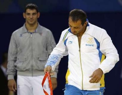 瑞典選手阿布拉哈米安憤怒摔下銅牌的一瞬間。