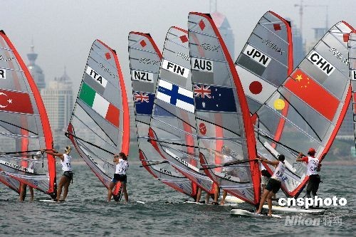 8月15日,青島奧帆中心,大型帆船托納多級(jí)和星級(jí)首次進(jìn)入比賽,中國選手首次露面。男女帆板各國選手繼續(xù)激烈競爭,中國女子帆板殷劍努力拼爭,試圖保持自己的總排名第一位置,奪金有望。中新社發(fā) 肖冰 攝