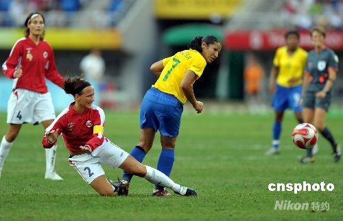 8月15日,奧運女足四分之一決賽在天津奧體中心水滴體育場舉行,由挪威女足對陣巴西隊,巴西上半時7號丹尼埃拉領先一球。中新社發(fā) 陳文 攝