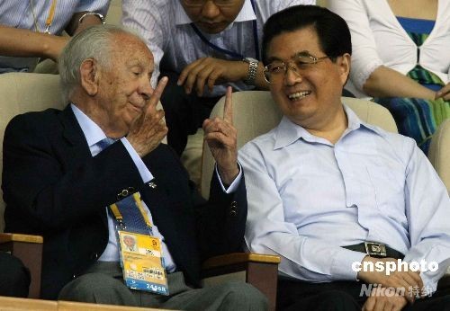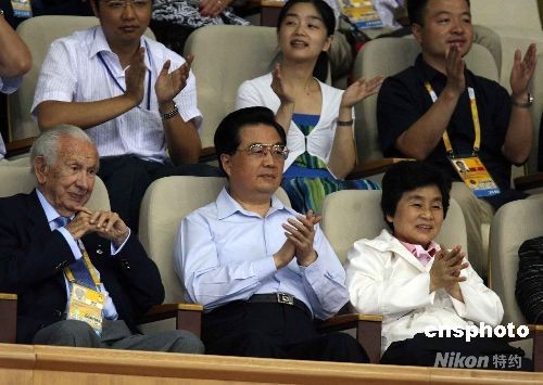 8月15日晚,胡錦濤夫婦與國際奧委會終身名譽主席薩馬蘭奇等到北京首都體育館,觀看北京奧運會中國與美國女排比賽。中新社發(fā) 任晨鳴 攝