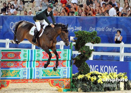 八月十五日晚,奧運(yùn)馬術(shù)在香港沙田舉行場地障礙個(gè)人賽及團(tuán)體賽的第一輪資格賽。雅典奧運(yùn)金牌得主巴西選手羅德里戈·佩索阿與坐騎“魯弗斯”在地障礙賽上登場。中新社發(fā) 鄧慶樂 攝