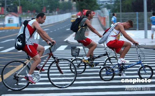 北京2008奧運會青島分賽場的奧帆村居住著來自世界各地的400多名運動員,許多運動員在比賽之前選擇自行車運動為賽前的準備活動,“自行車比賽”場景經(jīng)常可見。中新社發(fā) 趙振清 攝