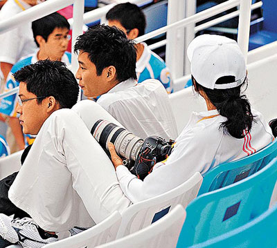 報(bào)道說,郭晶晶在第三跳前,霍啟剛才于水立方的觀眾席現(xiàn)身,相隔約一、兩分鐘后,朱玲玲和霍啟山也到場,三人并肩而坐;魡偙蝗珗鲇浾吲e機(jī)狂影,表現(xiàn)甚不自然,反而帶備Canon專業(yè)相機(jī)及長鏡的朱玲玲則投入其攝影世界,每逢郭晶晶和吳敏霞出場,她都即時舉機(jī)拍照。