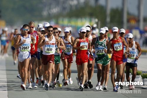 8月16日,北京奧運(yùn)會田徑比賽第二日,在北京國家體育場進(jìn)行的男子20公里競走中,俄羅斯選手瓦列里-博爾欽以1時(shí)19分01獲得該項(xiàng)目金牌。 銀牌被厄瓜多爾選手赫費(fèi)爾松·佩雷斯以1小時(shí)19分15獲得,銅牌被澳大利亞選手賈里德·塔倫特以1小時(shí)19分42秒獲得。 中國三名選手王浩、禇亞飛與董吉敏無緣獎牌。中新社發(fā) 盛佳鵬 攝