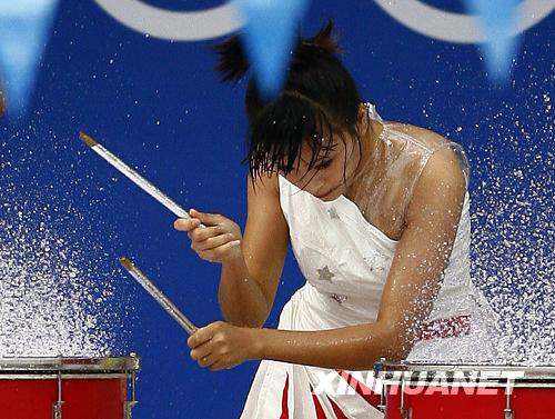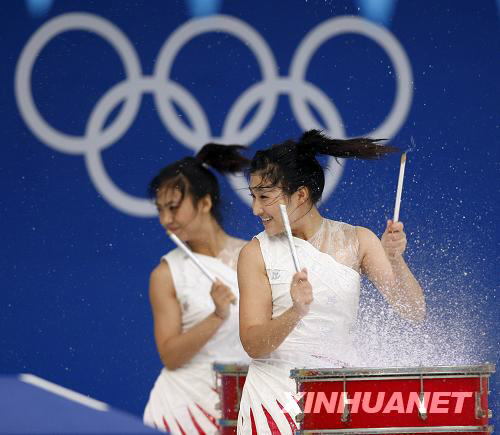 8月16日,演員們在游泳比賽開始前進行水鼓表演。當(dāng)日,北京奧運會游泳比賽繼續(xù)在國家游泳中心“水立方”舉行。 新華社記者費茂華攝