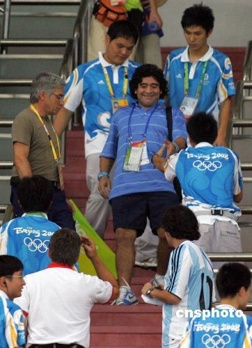 8月16日,北京奧運會男足,阿根廷VS荷蘭的比賽在上海體育場進(jìn)行。球王馬拉多納親臨上海為阿根廷加油助威。中新社發(fā) 湯彥俊 攝